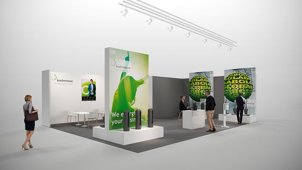 Die Preisangaben beziehen sich immer auf einen B8 x T7 = 56m² Eckstand. Andere Standgrößen und Standformen (Reihenstand, Kopfstand, Blockstand) sind modular adaptierbar und kalkulieren wir nach Ihrem Briefing gerne individuell für Sie.