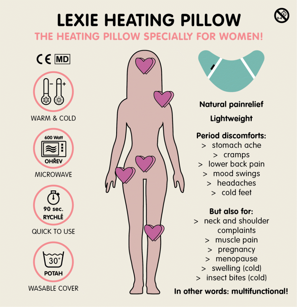 Basierend auf Forschungsergebnissen wurde das Lexie speziell entwickelt, um Schmerzen (wie Menstruationsbeschwerden, Schmerzen im unteren Rückenbereich, usw.) auf natürliche Weise zu lindern. Durch seine besondere Form passt sich das Kissen perfekt und bequem an deinen Körper an. Die Wärme und die Gewichtsverteilung lindern Schmerzen und sorgen für Entspannung, auch während der Schwangerschaft. Einfach in der Mikrowelle zu erhitzen, zum Beispiel.